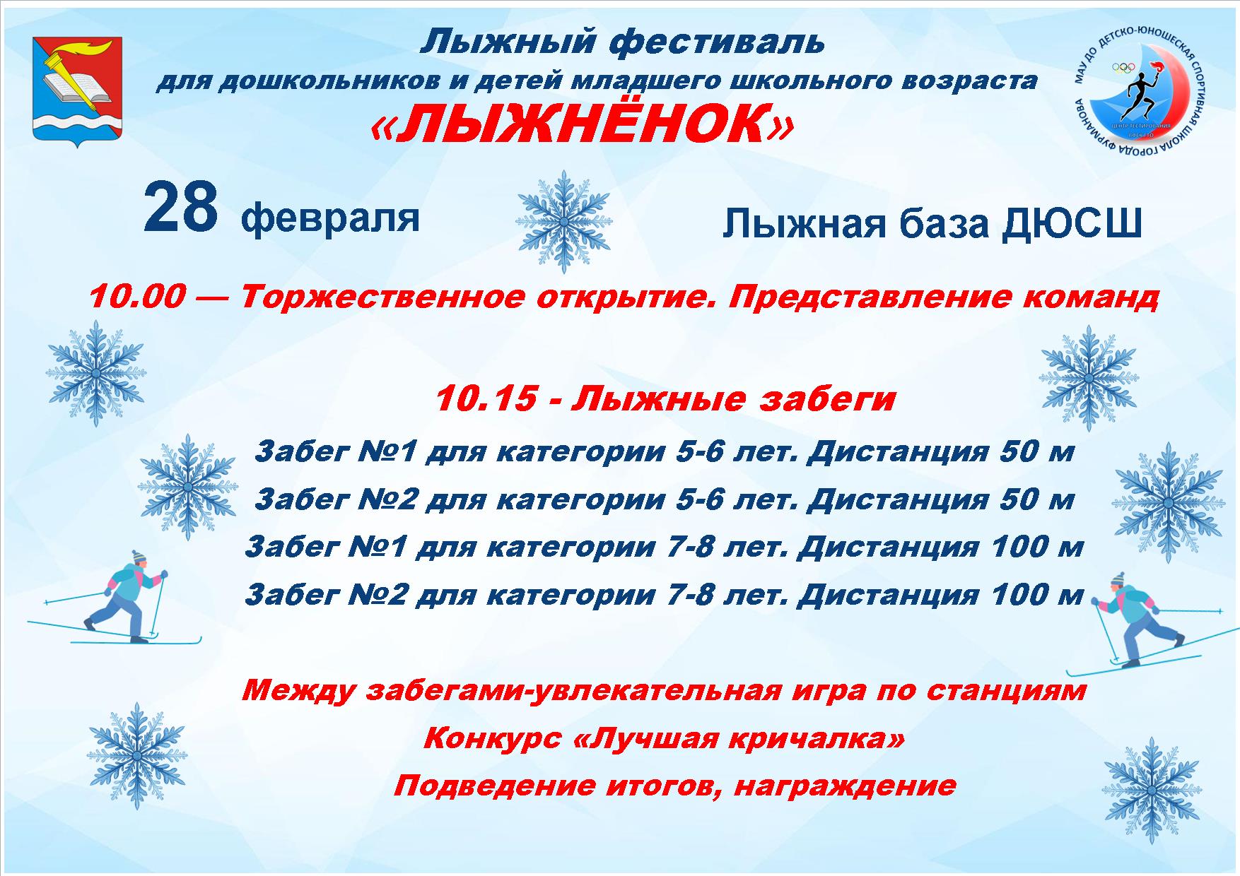 28 февраля 2026 года в Фурманове пройдет детский лыжный фестиваль. Мероприятие объединит юных спортсменов из всех детских садов и школ города. Фестиваль пройдет на лыжной базе ДЮСШ.